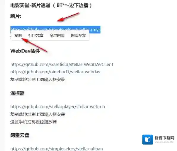 3、获取插件以后就会自动跳转到浏览器上打开一个网页,在网页上搜索“恒星播放器插件”然后选择一个自己需要的插件,双击这个,点击复制。