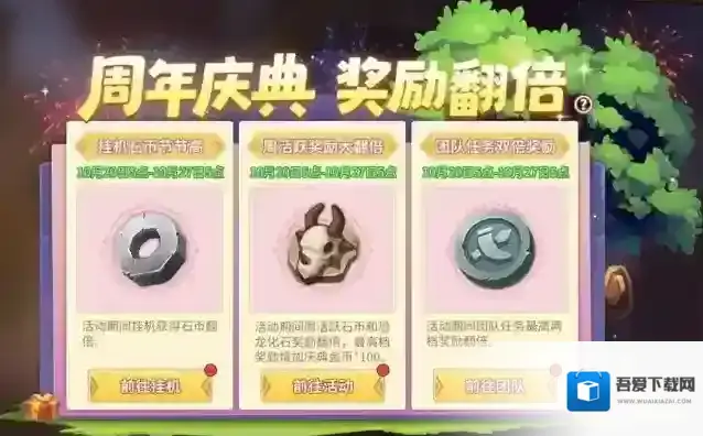 挂机获得石币数量提升100%;周活跃度奖励限时加码:石币 恐龙化石翻倍;最后一档限时增加庆典金币*100(价值100元);团队任务两档(90/120档位)奖励翻倍