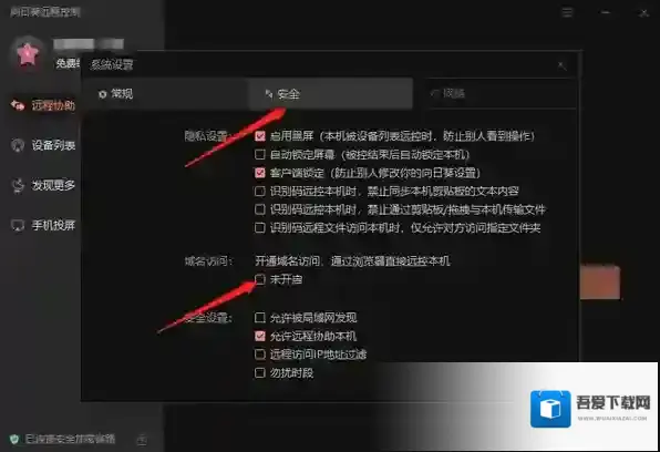 2、在设置的主界面切换到“安全”的标签页,然后通过寻找下方的“域名访问”区域,将“开通域名访问,通过浏览器直接远控本机”这个选项勾选上对勾即可。
