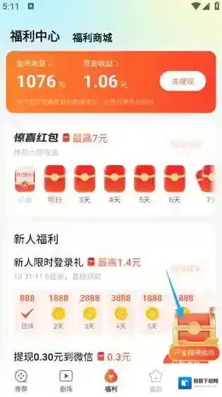 速看短剧app怎么赚金币,用户先在本站下载安装,打开app,进入主页点击”福利”,弹出新人7天登录礼,点击”立即领取”,还可以在福利中心点击领取惊喜红包,然后点击右下角”开启宝箱”,也能领取金币。
