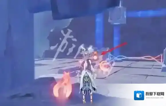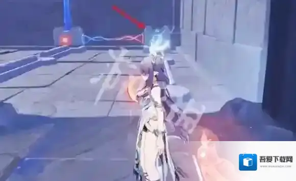 4、看右前方的镜子,将箭头处的物体吸过来,从而推动雕像。