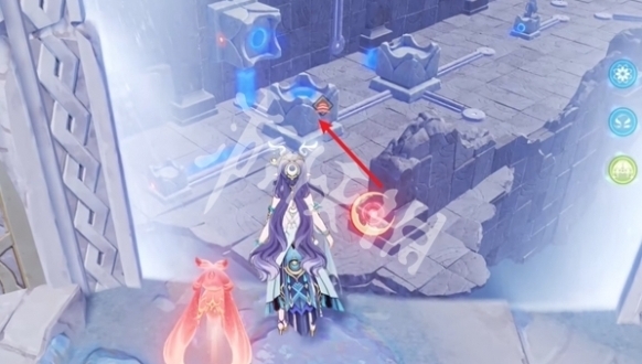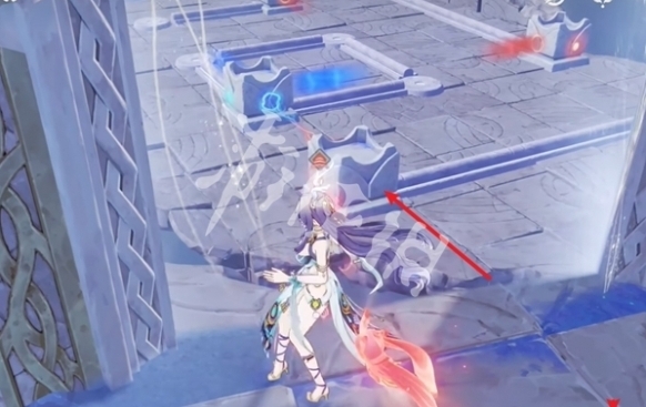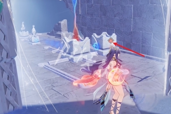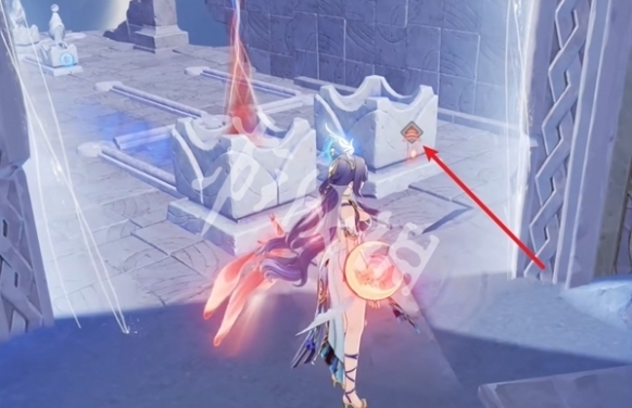 4、走到图中的位置,将箭头处的雕像拉过来,拉三次到镜子前即可。