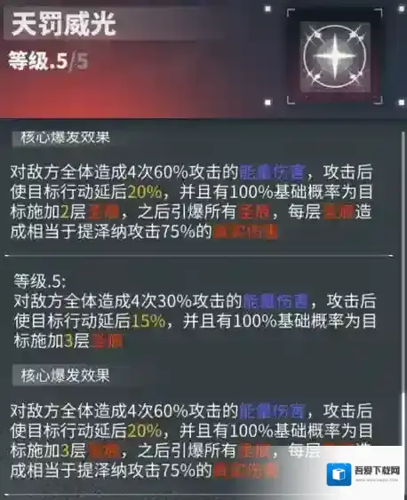 当提泽纳发动“天罚威光”时,她会对敌方全体造成能量伤害,并在攻击后让主目标的行动延迟,附加更多的圣痕。这使得提泽纳在群体战斗中表现出色,能够有效控制敌人的行动节奏,让敌人难以摆脱她带来的持续伤害。