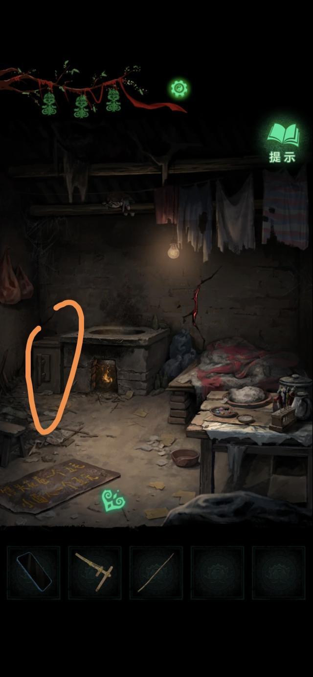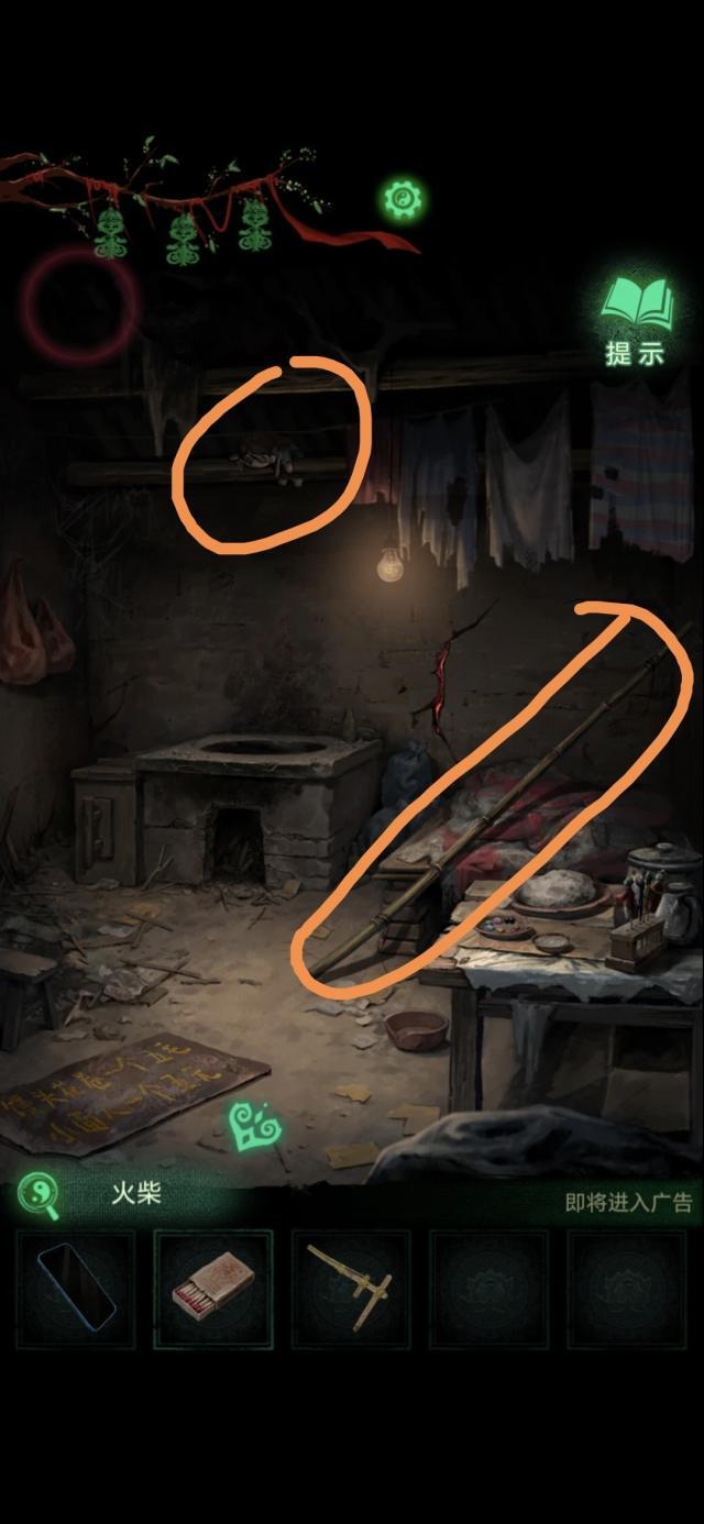 点击获得房间里的晾衣杆,用晾衣杆捅房梁上的布娃娃,娃娃掉在炉灶里,获得石片和棺材钉