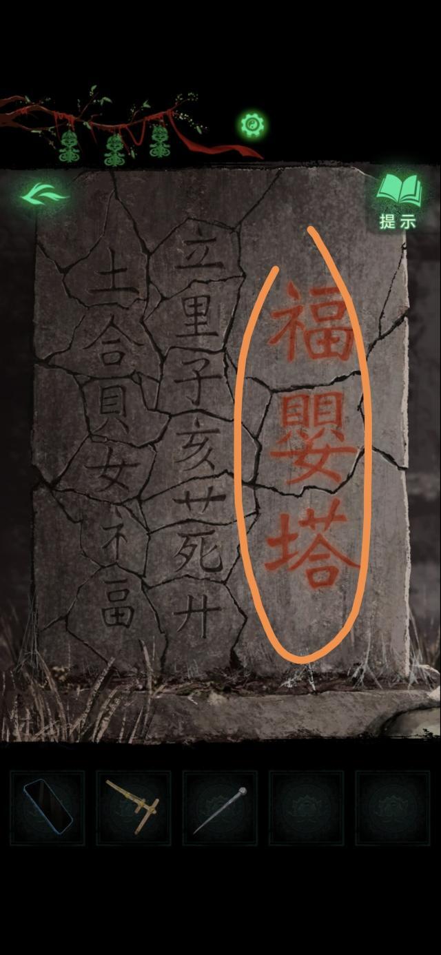 把石片放在碑上,根据福婴塔的偏旁部首点击左边的石片,直到右边字全亮,左边房间门开