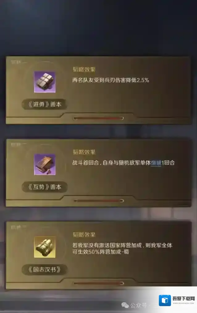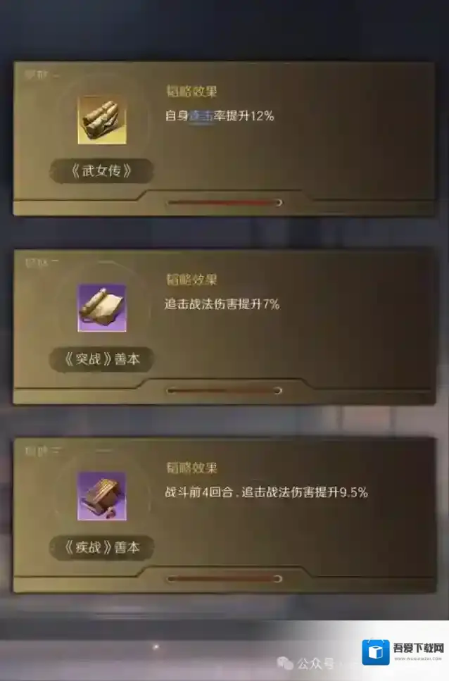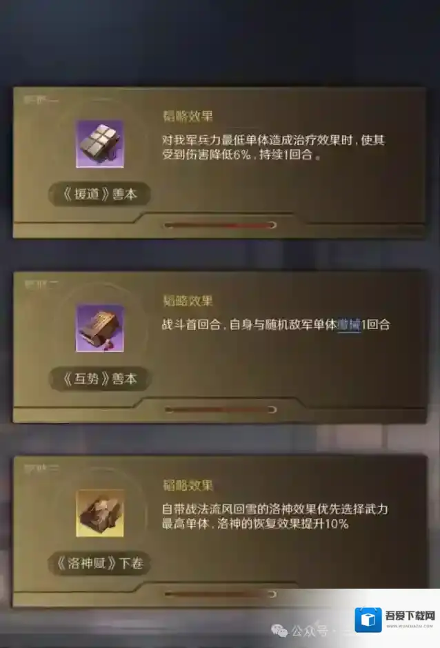 兵书方面:三位武将都需要金书,刘备金书选择国志汉书,甄洛金书选择相怜洛神赋下。貂蝉刘备、甄洛其他兵书建议选择先勇、互势、兵令等。孙尚香选择增伤类兵书即可。