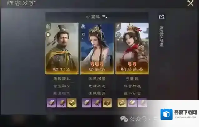 阵型选择:方圆阵,刘备、甄洛前排抗伤,孙尚香后排吃连击率加成。