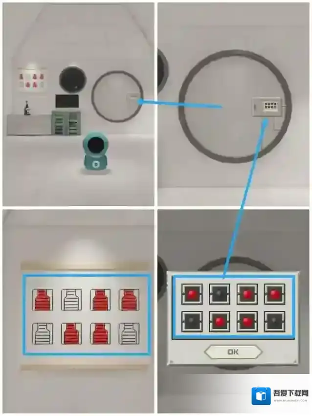 12.点击主板柜门上的密码锁,根据[机器人]场景灯泡闪烁顺序,按顺序按下按钮
