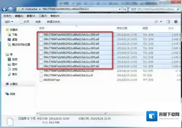 第五步:从为的电脑进入目录后,按下图所示,进入腾讯视频的节目缓存文件夹,在“vodcache”隐藏属性的文件夹下,可以看到许多.tdl文件,它们是视频的分段文件。