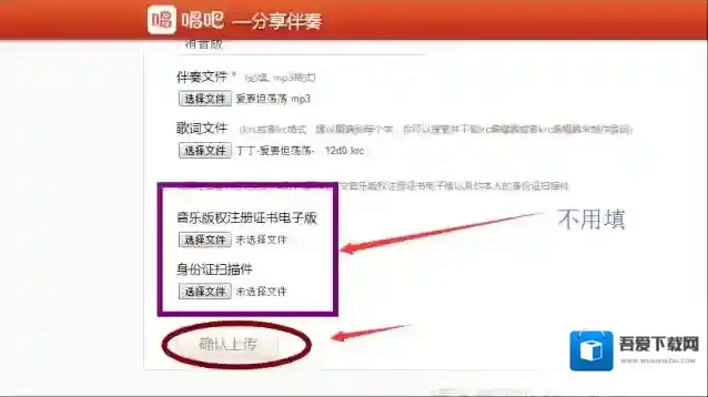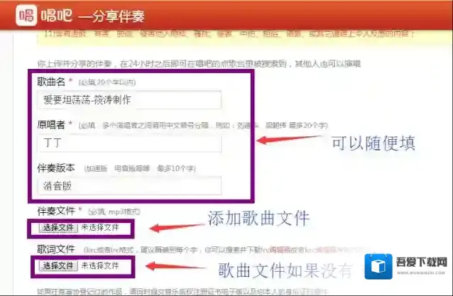 5、歌名可以随便填,建议加上自己的名字到时候搜自己的名字就可以搜到,原唱也可以随便填,版本可以不填。