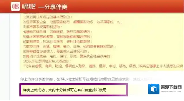 9、上传成功,等待审核,大约十分钟可以在唱吧搜到,最迟的话一天之内搜到。