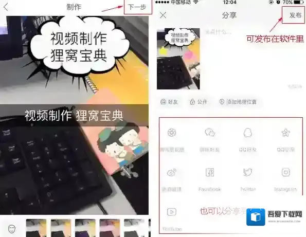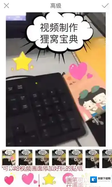 6、还可以选择添加饰品类似小的水印图片,也可以用画笔直接在视频画面上手写、画画的那种,也可以删除掉不喜欢的视频图片。添加完成后点击画面右上角的“√”,返回到制作界面。