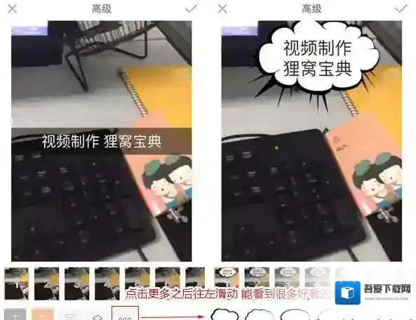 5、除了添加有底色的文字之外,还可以点击三个圆圈往左边滑动可以看到很多好看的对话框哦,从里面选择喜欢的对话框,气泡等样式。