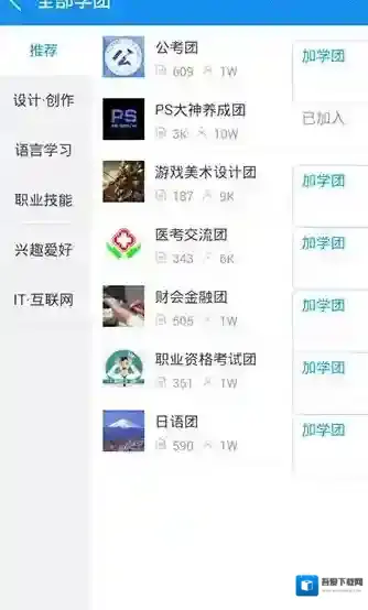 3、进入到加学团界面后,你可以根据自己感兴趣的课程找相应的学团,找好以后就点击该学团右侧“加学团”按钮即可,如下图。