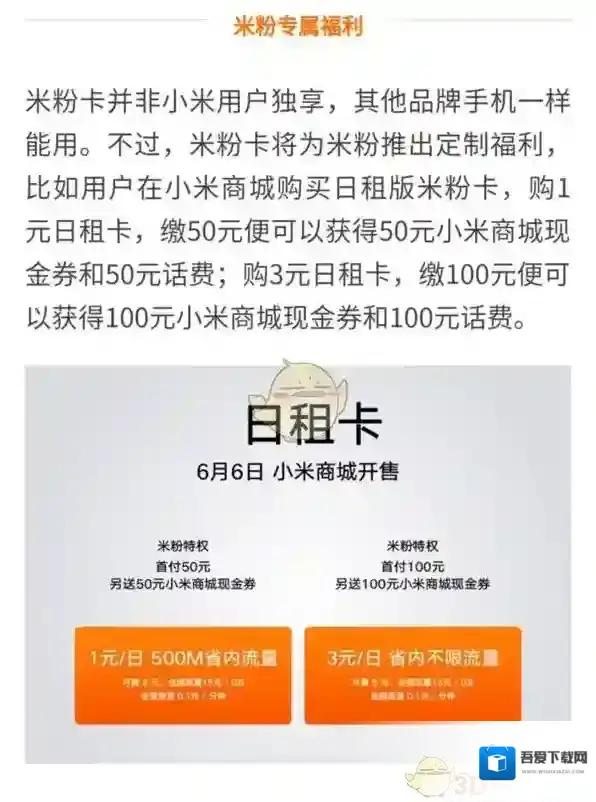 2017年6月6号小米正式发布了米粉卡日租卡,此套餐只要5元月租,分为两个版,一是针对用流量少的用户每天一元500兆省内流量日租卡可叠加,还有就是3元省内不限流量使用日租卡,流量不用不掏钱。