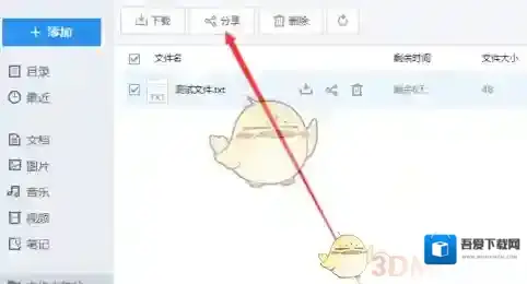 3.待上传完成后,在微云客户端左侧列表点击“文件中转站”,找到要上传的文件,点击“分享”。