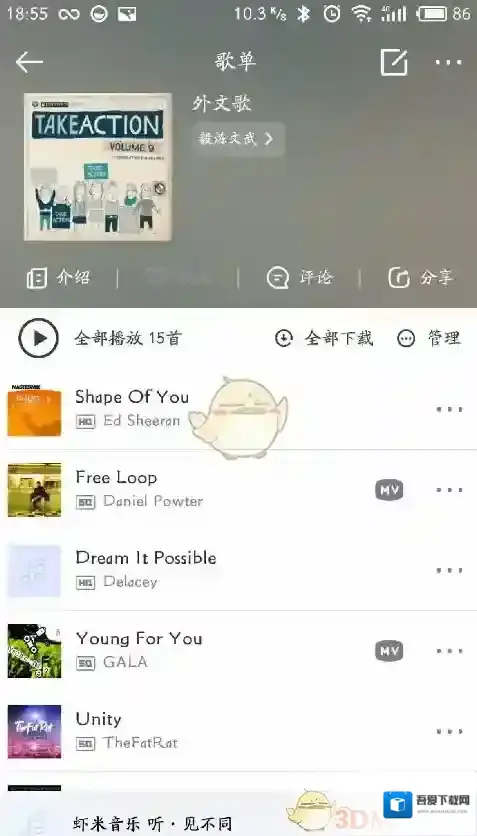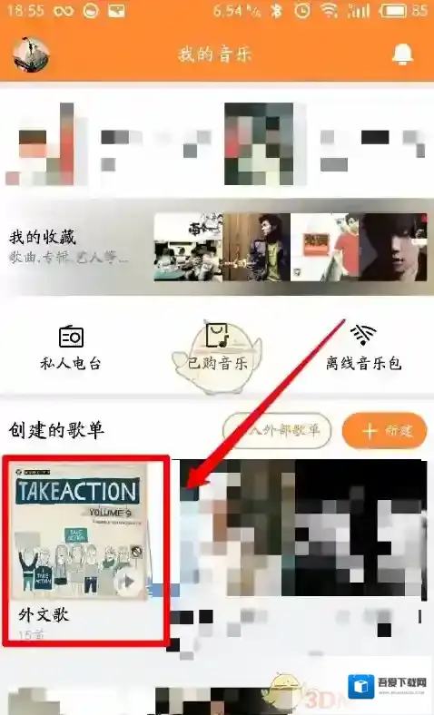 2、接着,在“音乐”界面中找到我们要导入虾米音乐的歌单,并点击其后面的“菜单”按钮,