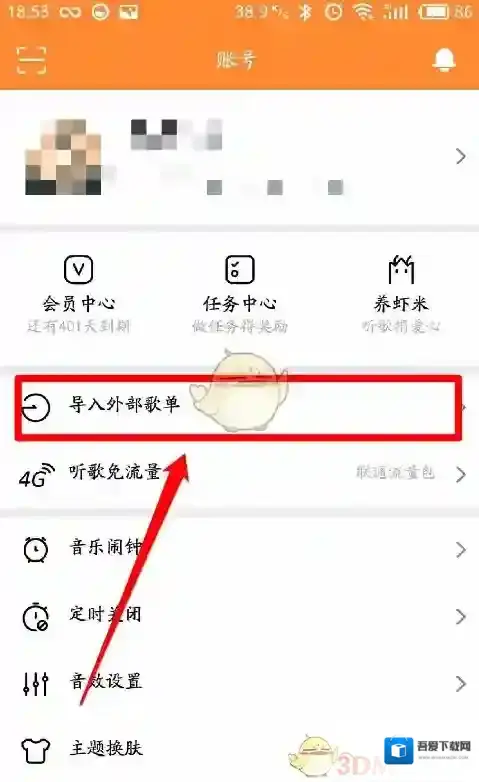 5、然后,我们打开虾米音乐APP,点击底部的“账号”按钮,在账号界面中找到“导入外部歌单”项目并打开它,