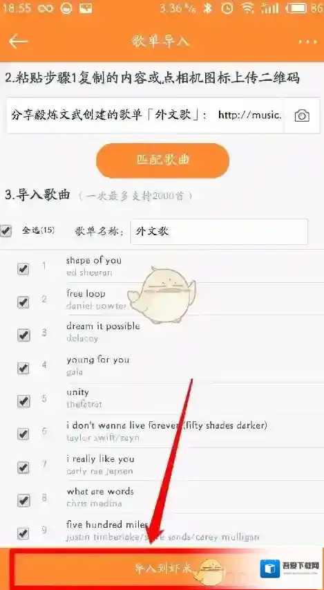 8、我们看到匹配结果后,点击底部的“导入到虾米”按钮,即可将我们的歌单导入到虾米音乐中,