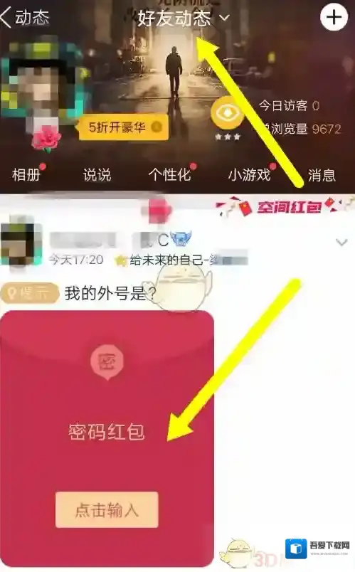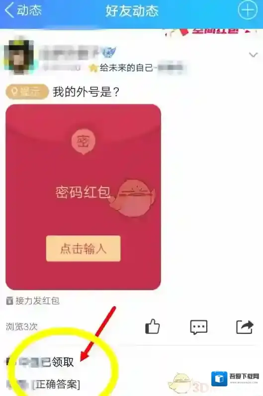 5、我们可以看到红包已经出现在空间动态里,点击红包上面的输入答案即可开始回答提问。