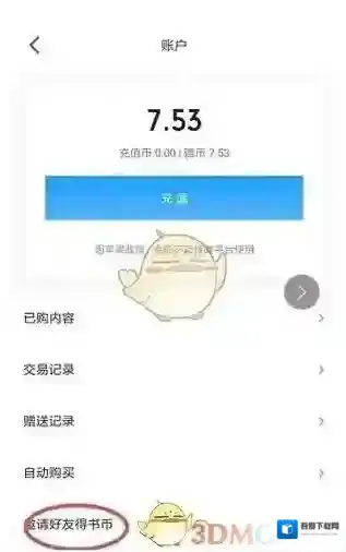5.除了充值我们还可以通过邀请好友的书币,点击账户最下面的邀请好友的书币,每邀请一位好友得5书币。