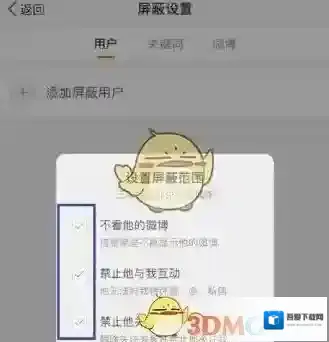 选择屏蔽选项,我们全部屏蔽,你可以不选择禁止它关注我不要选,别人一般不会发现你屏蔽了,如下图所示: