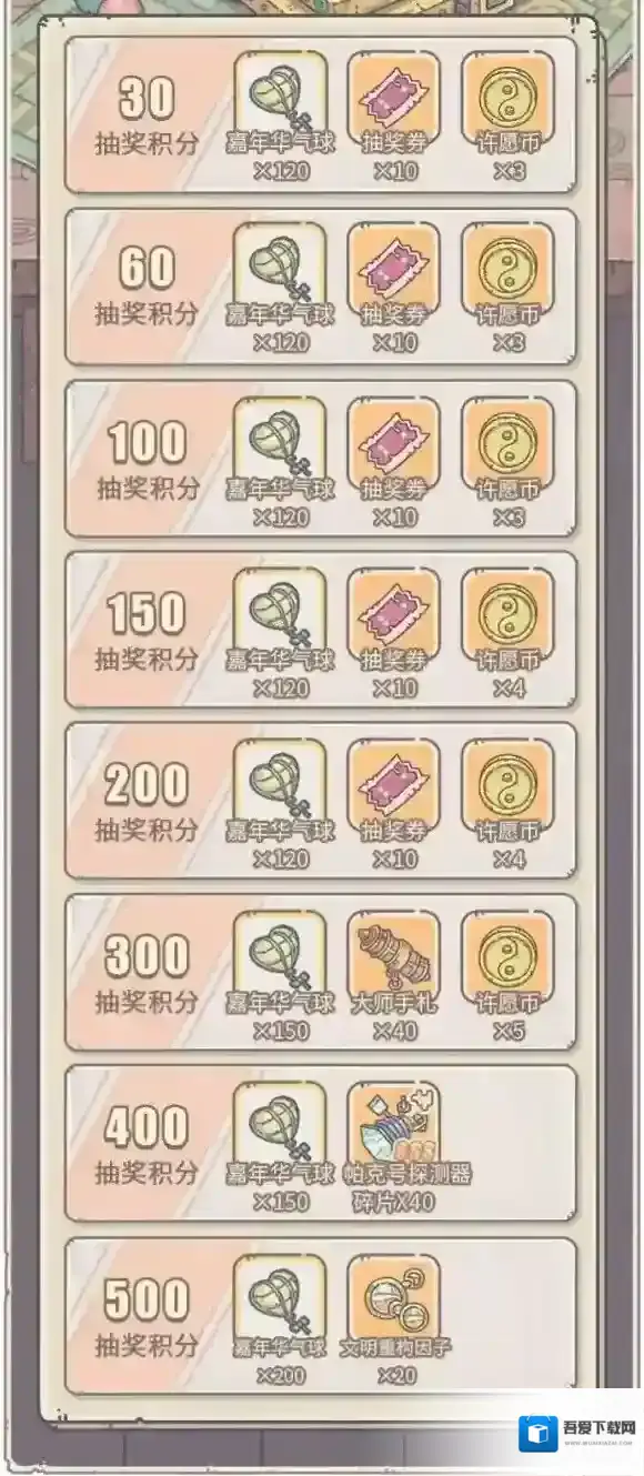 活动期间,每进行1次抽奖,可获得1个积分。累积对应的活动积分,可获得以下奖励。