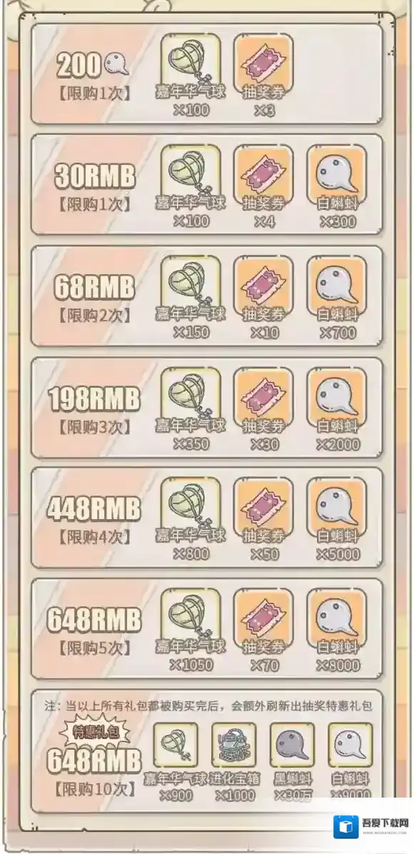活动期间,每天会在贩售机中出现福利礼包,每天5点刷新,售价1白蝌蚪。内容为:白蝌蚪×20、抽奖券×3、嘉年华气球×100
