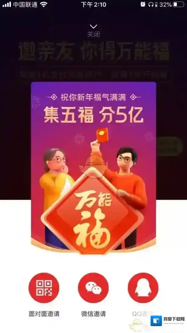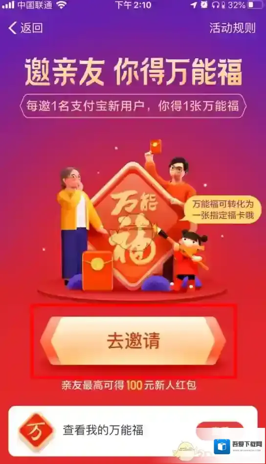 万能福需要邀请一名新用户注册支付宝,并完成实名认证后即可获得。你可以将邀请分享给好友,通过你分享的进行注册的新用户,一旦注册并完成实名认证后,你就可以获得一张万能福卡了。