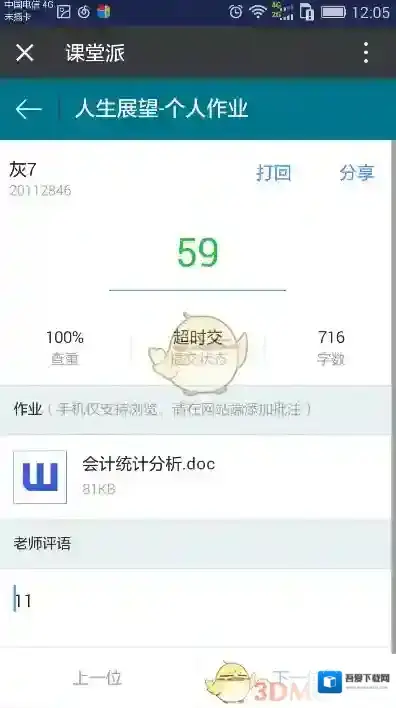 3、在作业详情页中,可以给学生作业打分、评语,还包含了打回、分享该学生。