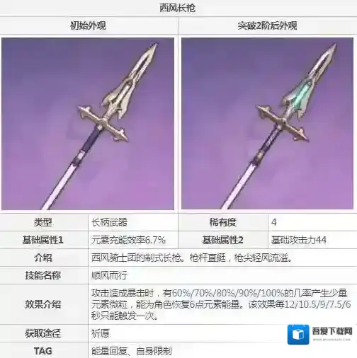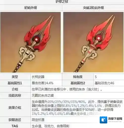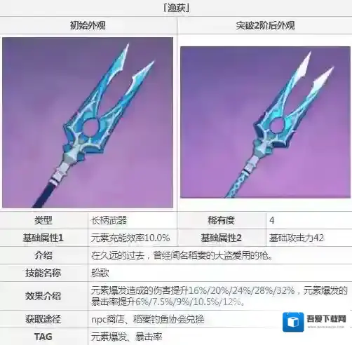 推荐理由:可肝武器,通过稻妻钓鱼协会兑换获取。副属性提高元素充能效率,被动提高了元素爆发的伤害和暴击率,对于本身就依靠元素爆发进行输出的香菱而言是4星武器中的首要选择,而且也相对于其他具有限制条件的5星武器更为出色。暴击率的提升减轻了圣遗物词条的压力。