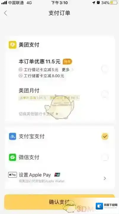 4、最后我们在美团下单支付订单的时候,就会看见支付宝支付出现了。