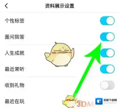 5、然后点击匿问我答后面的“蓝色按钮”,关闭后,资料卡中就不会展示匿问我答栏目,别人也无法查看你的回答。