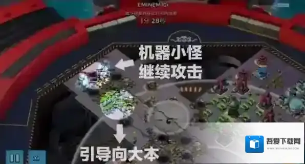 部队推进的同时,利用火炮炸机器小怪监狱和冷冻炸弹,减少火箭发射器和震爆火箭炮对部队的影响(保持一定时间间隔,注意部队的位置)。