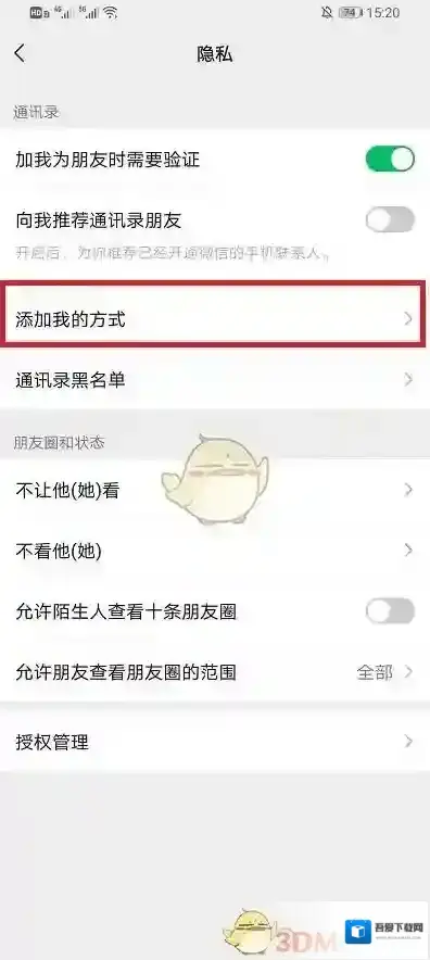 4、在隐私界面中我们需要点击添加我的方式进入到界面中;