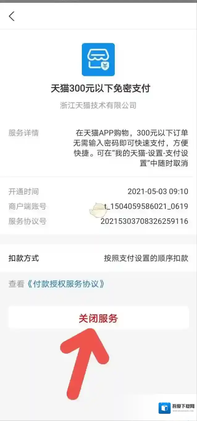 5、在免密支付页面,点击“关闭服务”就可以了。