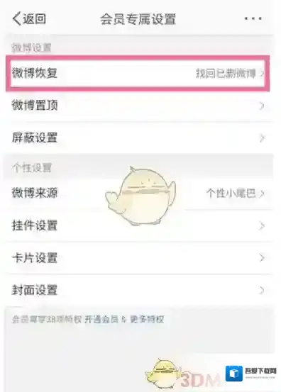 3、在会员专属设置中,点击微博恢复选项,恢复想要恢复的文章即可。