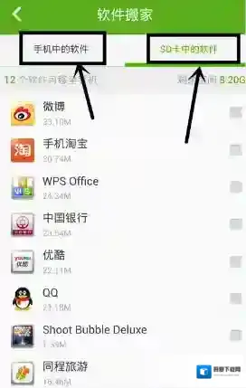 3、进入软件搬家的页面之后,就能看见手机中的软件和SD卡中的软件,手机内存不够那肯定是将手机内的软件搬家到SD卡中去。将后面的选项框勾选就够了。