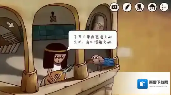 点亮火把,点击蓝鸟,惊动鸟儿,从火把前飞过时会因为惊慌落下一片羽毛在栏杆上。