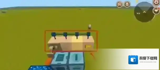7.另外一个推拉机械臂后面安一排方块,用电线连接通电,同样再安一个按钮。到这里最简单的自动电梯就做好了,按下方按钮电梯上升。按上方按钮电梯下降。