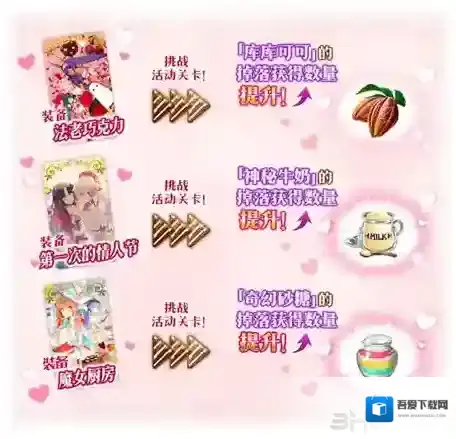 通过装备卡池抽取的氪金礼装礼装,可以提升商店材料「库库可可」「奇幻砂糖」「神秘牛奶」的获得量↑