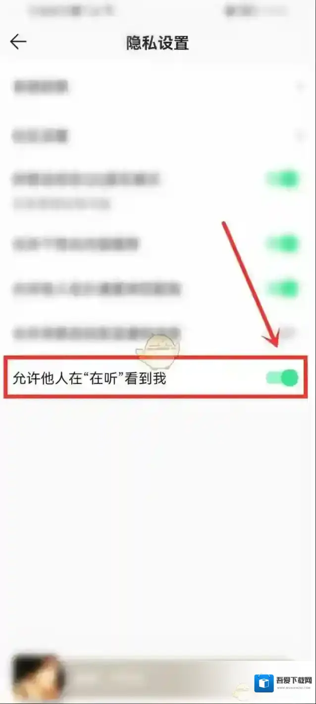 6、进入隐私设置页,打开“允许他人在在听看到我”开关即可。