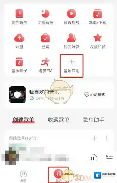 1、打开网易云音乐,点击我的,找到音乐应用,点击加号。