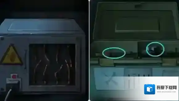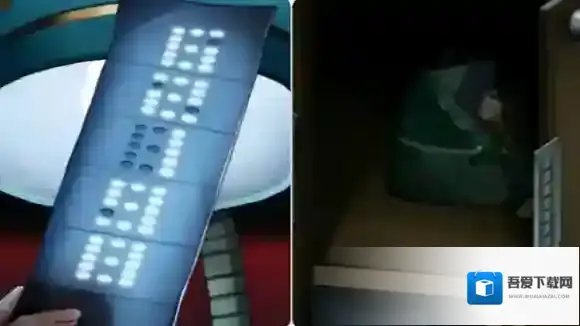 7、点击病床右侧红灯区域,根据机器提示,即上下点数相加为6,使用胶带完成解密,根据心电图的高低位置,打开工具箱,获得螺丝刀和锤子。