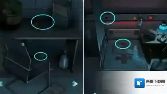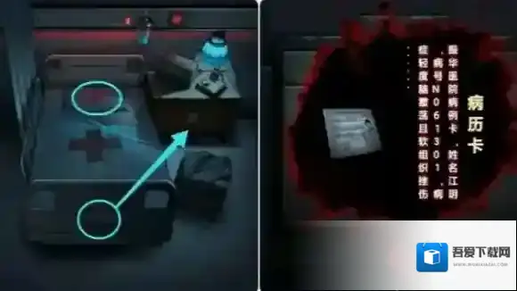 1、进入病房触发剧情,点击枕头下的手机,将手机关机,查看床尾的病例卡,得到密码N061301,打开床头柜,得到数据线。