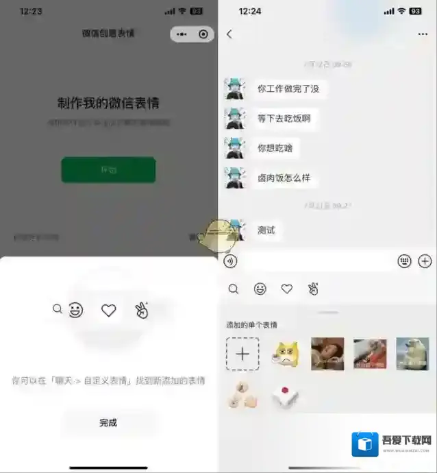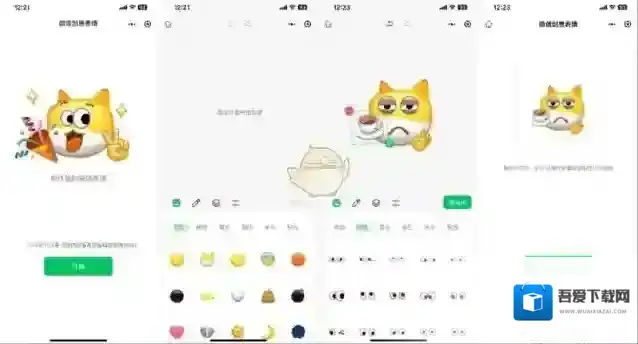 3、用户可以自定义选择微信官方表情为素材,加以不同的眼睛、眉毛、嘴巴、身体手势、配饰制作表情包,还能自定义添加文本和涂鸦,制作完成后点击「就这样」,就可以添加到自己的微信表情。