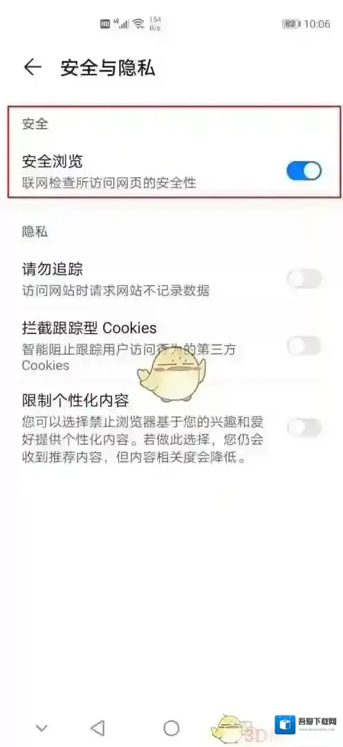 3、将安全浏览右侧的开关关闭即可解除网站访问限制。