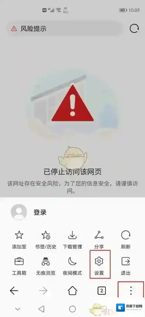 1、打开华为手机自带的浏览器后,点击下方的三点图标,然后点击设置。