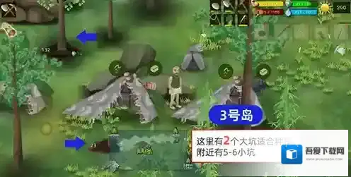 ②收集1号出生地岛上的所有材料以后,吃饱后去右下角的2号主岛建营地,(为什么我让大家去2号岛而不是3号呢,因为2号岛有2个非常接近的鳄鱼刷新点适合安家和很多大小坑位适合种植和捕猎)。