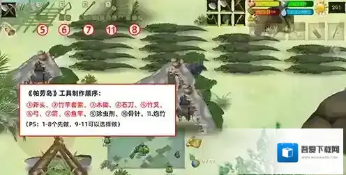 开局制作工具的先后顺序:①斧头、②竹竿套索、③木锄、④石刀、⑤竹叉、⑥弓、⑦箭、⑧鱼竿、⑨除虫剂、⑩骨针、11炮竹。